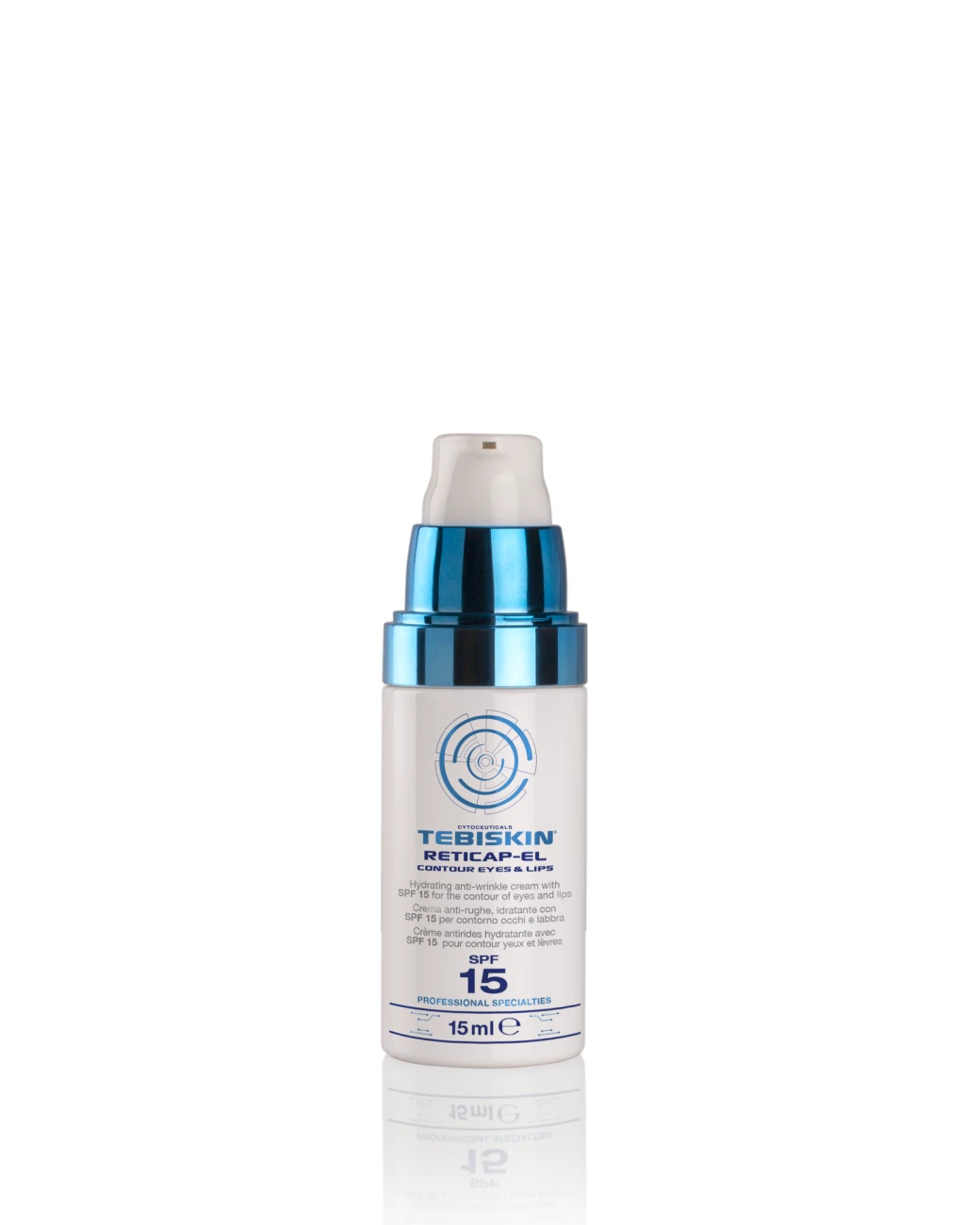 TEBISKIN® Reticap-EL SPF 15 is a product based on pure micro-encapsulated Retinol, specific for the delicate and sensitive eye and lip contour area. Its effective deep and long-lasting moisturising and toning action reduces the visibility of wrinkles, fine lines and “crow’s feet” and counters the gravitational drooping of the upper eyelid. The UVB and UVA filters (SPF 15) contained in the product protect the delicate skin of the eye and lip contour from solar radiation. Thanks to the Skin Flash App Technology, the results are evident already a few minutes after application: the skin immediately appears smooth and silky and the visibility of wrinkles is markedly reduced. The product spreads easily and is absorbed quickly.